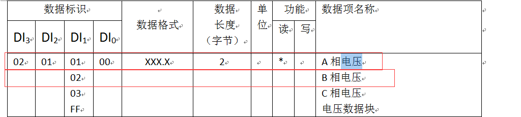 寄存器地址:查表获取,比如DL/T645-07协议的A相电压,查表对应的数据标识是02010100,B相电表对应02010200。