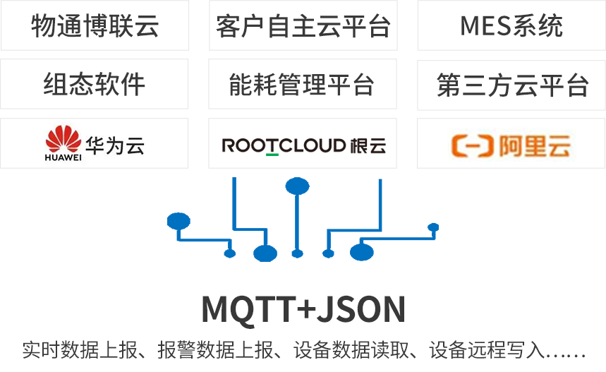 北向支持MQTT协议接入豪门国际云平台,客户自主开发的云平台,第三方云平台(根云、美云、华为、阿里、百度、微软等IOT云平台),组态软件、MES系统、ERP系统等工业软件