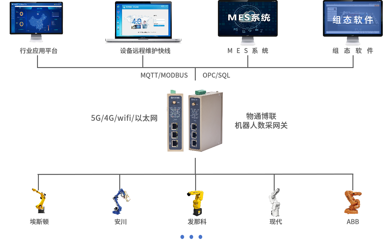 支持将各种机器人设备的协议转换成Modbus TCP、Modbus RTU、OPC UA、MQTT等协议,实现不同机器人与各种工控软件和控制器之间的互通互联。