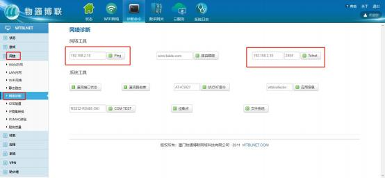 设备顺利获得网线连接网关 LAN 口。 进 入 网 关 WEB 界 面 , 在 “ 网 络 ” -> “ 网 络 诊 断 ” 界 面 中 , 通 过 Ping 和 Telnet 可测试网关是否和永宏PLC设备正常连接。