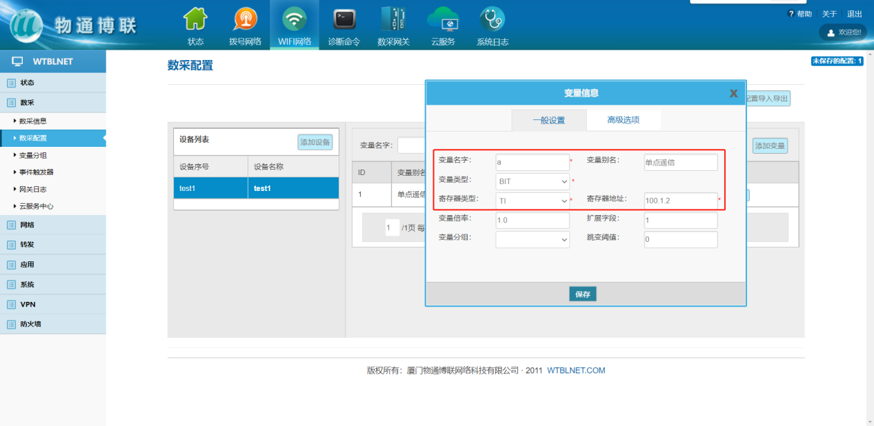 2、数采-变量配置 变量配置主要定义变量名(任意)、变量别名(任意)、寄存器类型(固定选择T1)、变量类型和寄存器偏移地址(例如100.1.2,其中100为固定,1为单点遥信类型标识,2为点位序号)。 点击添加变量,填写相关信息。