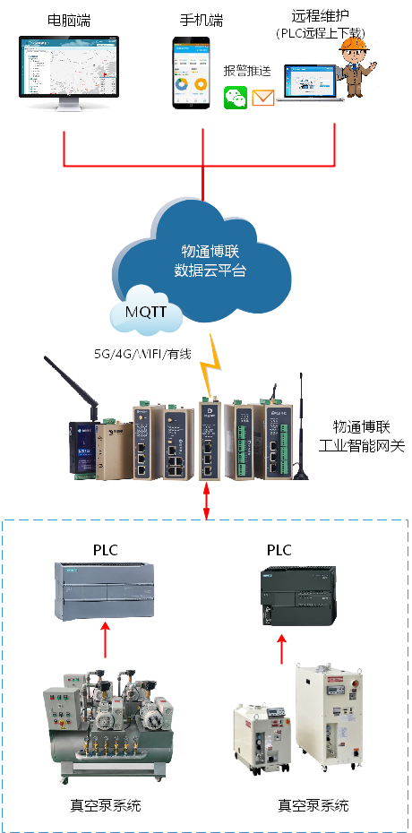 半导体工业正在逐步实现自动化生产,真空泵系统顺利获得PLC自动化控制已经得到广泛应用,因此只需要将豪门国际工业智能网关接入到PLC,就能实时采集PLC内真空泵的工作参数(压强、温度、振动等)并顺利获得5G/4G/WIFI/以太网等方式上传到云平台或本地上位机,进而实现设备远程监控、故障报警、远程控制及远程维护等功能。